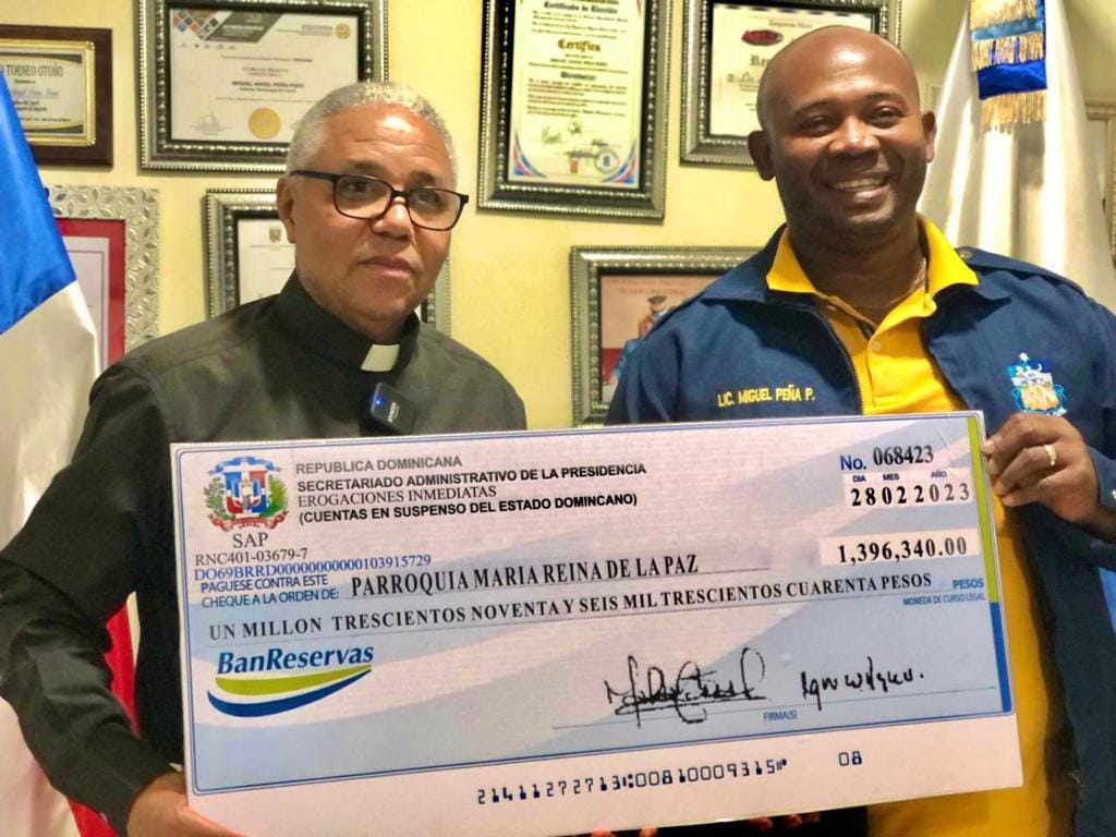 El Párroco Samuel Casilla, conjuntamente con Peña Pozo recibieron este viernes el aporte de Un Millón Trescientos Noventa y Seis Mil Trescientos Cuarenta pesos (RD$1,396,340.00) para que se haga realidad la compra del vehículo.