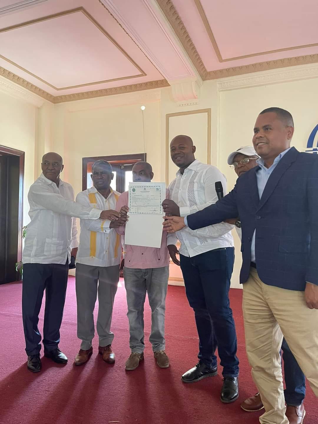 El Carril, Distrito Municipal. – El Alcalde Distrital Miguel Ángel Peña Pozo (Chimbili) recibió este miércoles a nombre de la Junta Municipal de El Carril, el título de propiedad para la construcción del Polideportivo, de manos del Gerente Provincial del Instituto Agrario Dominicano (IAD) Ángel De León.