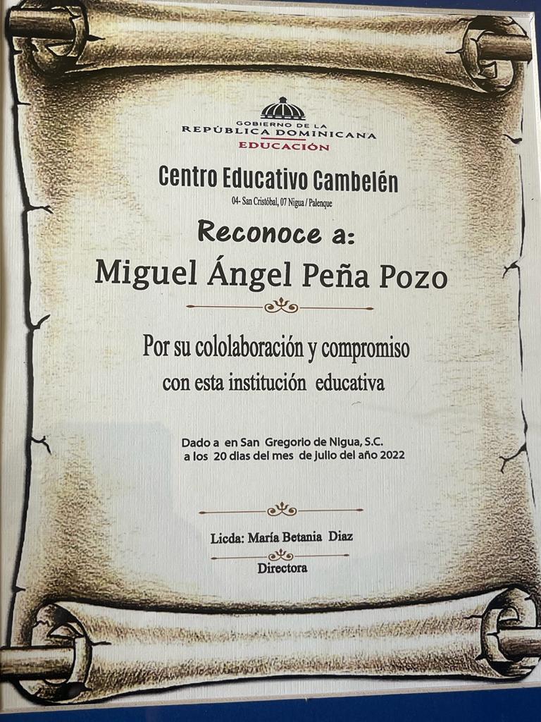 Peña recibe reconocimiento por su colaboración y compromisos asumidos en este centro educativo del Municipio de Nigua, de la mano de su directora Lic. Maria Betania Diaz y de la técnico del departamento de Participación Comunitaria Lic. Lissette M Frías del Distrito Escolar 04-07, donde además fue reconocido el alcalde de Nigua Jorge Carela y el Regidor Gros.